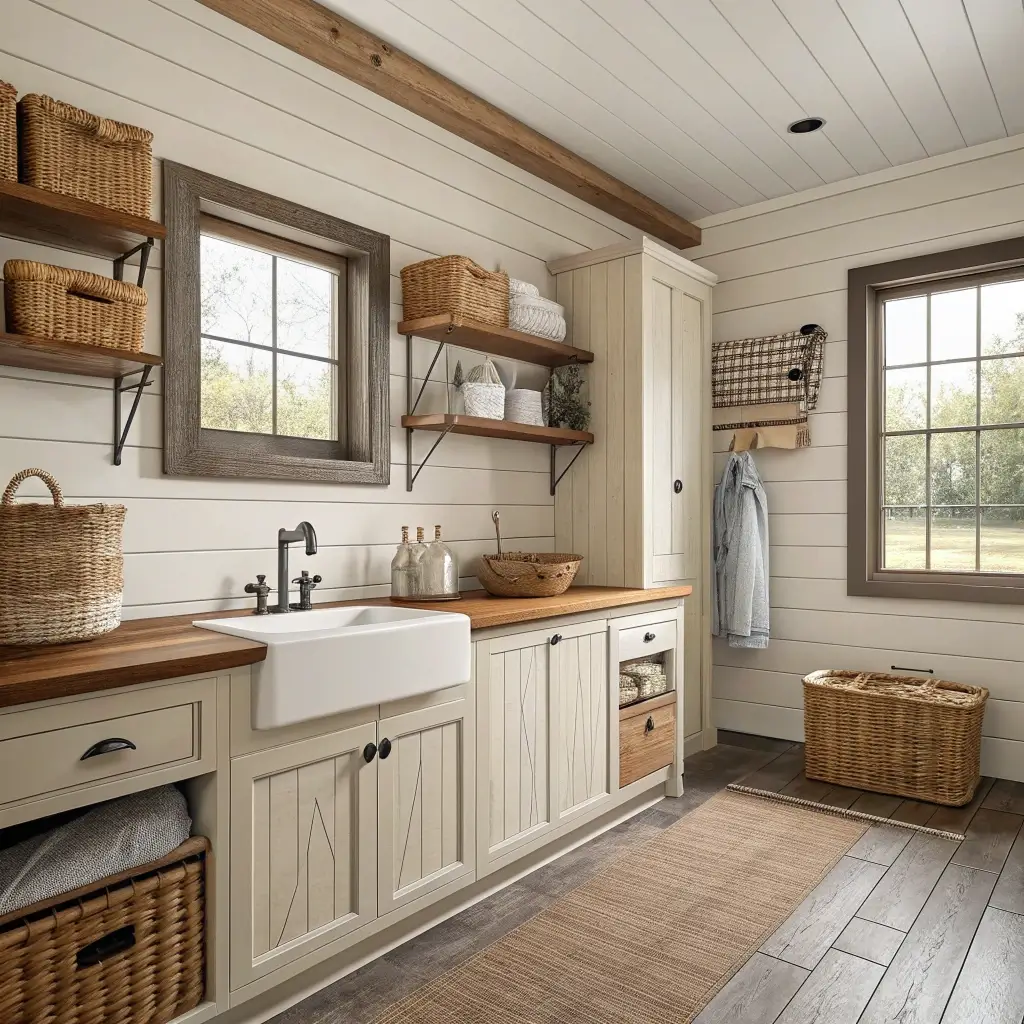 Nothing says “homey” quite like farmhouse charm, and honestly, laundry rooms eat this style up. Shiplap walls instantly add texture and that coveted Joanna Gaines vibe. Pair them with vintage-inspired washboards as decor, and suddenly you’re channeling serious prairie chic energy.