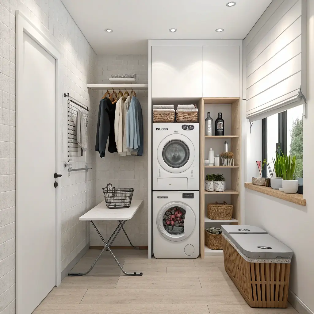 Start by thinking upward. Install cabinets all the way to the ceiling – those extra inches matter more than you think. Stackable washer-dryer units free up precious floor space for other essentials. Wall-mounted drying racks fold flat when not in use, and sliding barn doors save the space regular doors waste when they swing open.