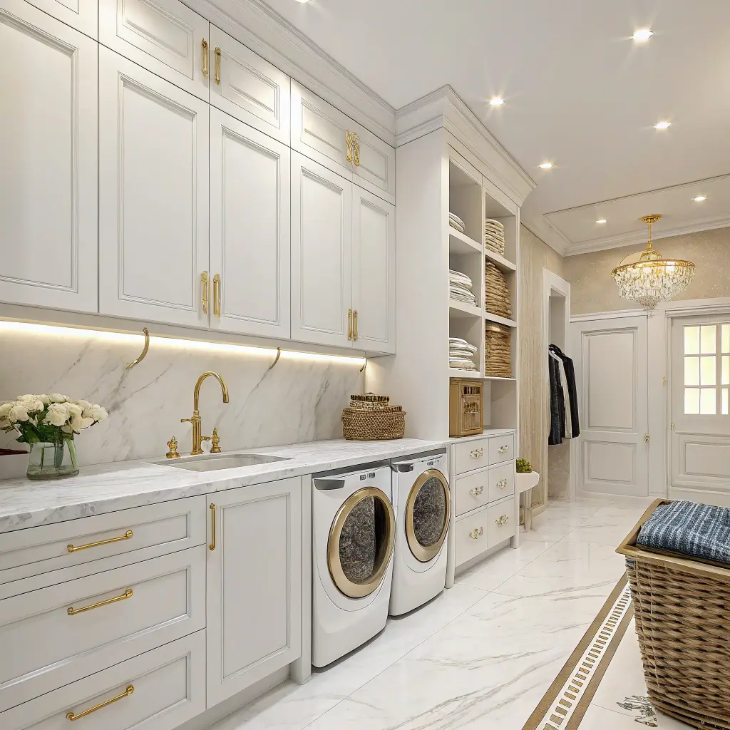 The key? Restraint. Gold accents should enhance, not overwhelm. Think jewelry for your laundry room – a little goes a long way.
