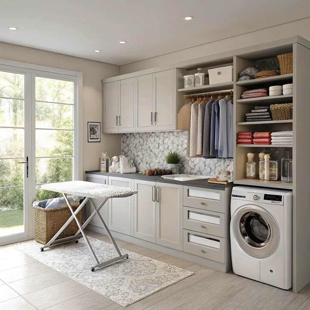 Build in an ironing board that pulls out from a drawer or folds down from the wall. Install a hanging rod directly above for freshly pressed items. Add a small TV or tablet holder – might as well catch up on shows while you work.