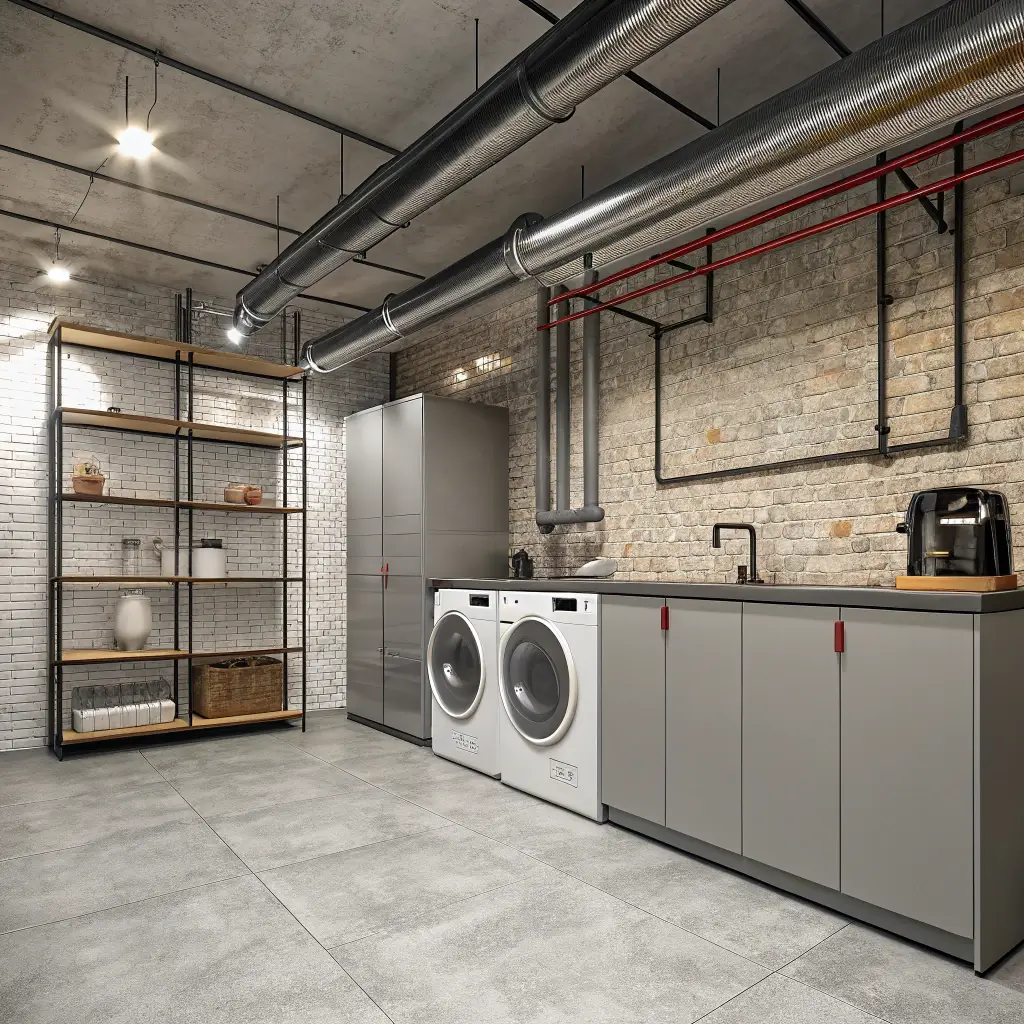 Industrial style brings urban edge to utilitarian spaces. Exposed pipes become design features. Concrete floors meet subway tile walls. Metal shelving and Edison bulbs complete the warehouse vibe.