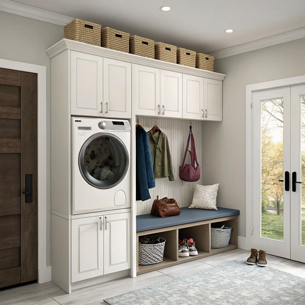 Why waste space on single-purpose rooms? Combining laundry and mudroom functions maximizes every square foot. Built-in cubbies store shoes and backpacks while you run a load.
