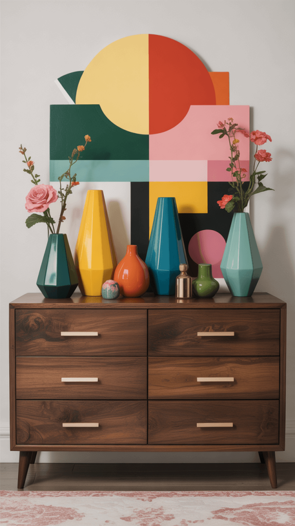 - If you have a traditional, wooden dresser, modernize it with your decor: a sleek, abstract sculpture, a geometric lamp, a minimalist photo frame.