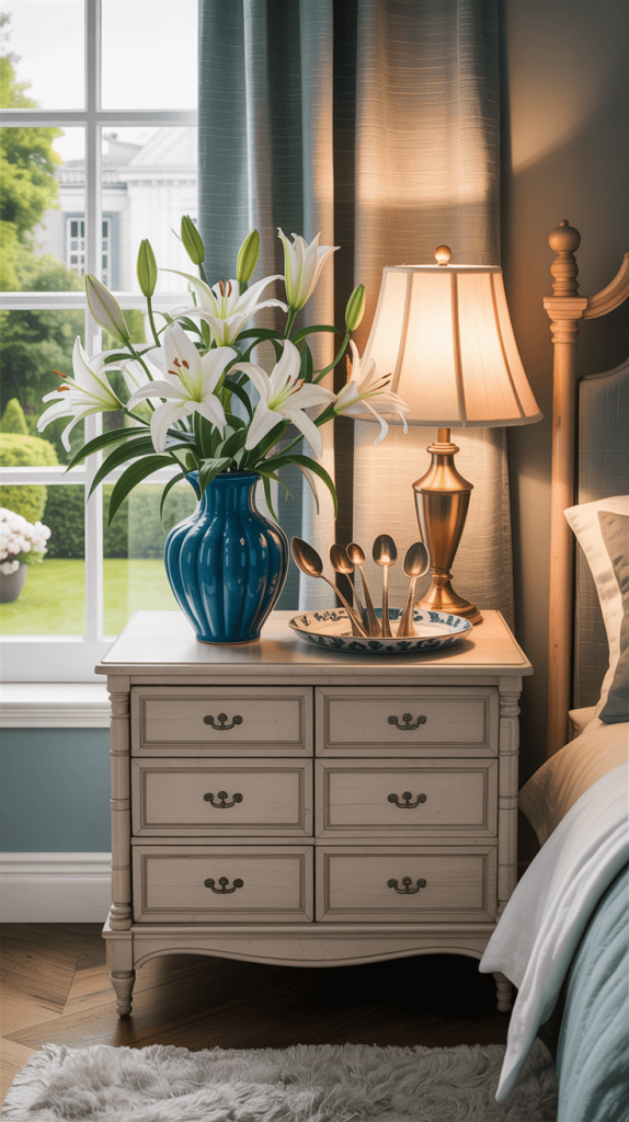 - Choose Your Tray Style: The tray itself is a decor piece. A lucite tray feels modern and light. A vintage-inspired brass tray adds glamour. A rustic wooden dough bowl brings in organic texture. Pick one that complements your bedroom’s overall vibe.