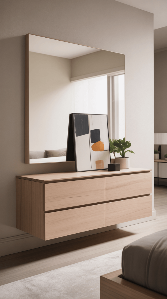 - Embrace Negative Space: The point of a floating dresser is to feel open and uncluttered. Don’t cover the entire surface. Choose one or two key items and let the beautiful, empty space be a feature itself.