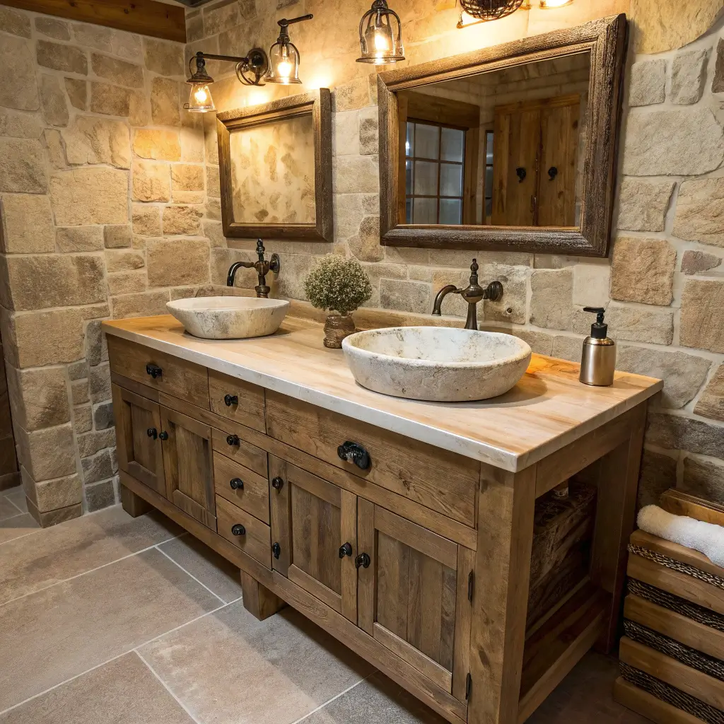 Now, if sleek and modern isn’t your jam, let’s talk rustic. I helped my sister design her cabin bathroom last year, and we went full rustic with a reclaimed barn wood vanity. The character in that wood? Unmatched.