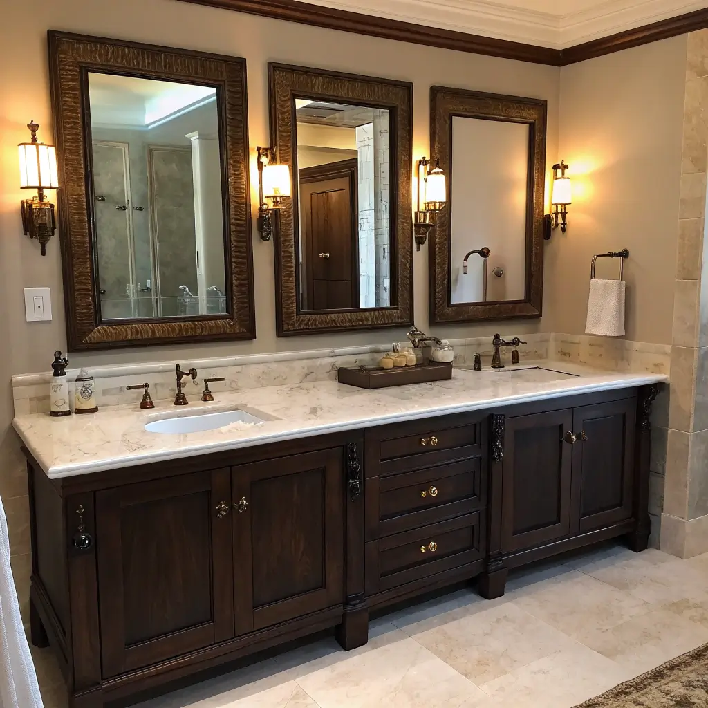 Dark wood vanities make a statement like nothing else. I’m talking rich mahogany, deep walnut, or ebony stains that add instant sophistication. My master bath features a dark walnut vanity, and three years later, I still stop to admire it.