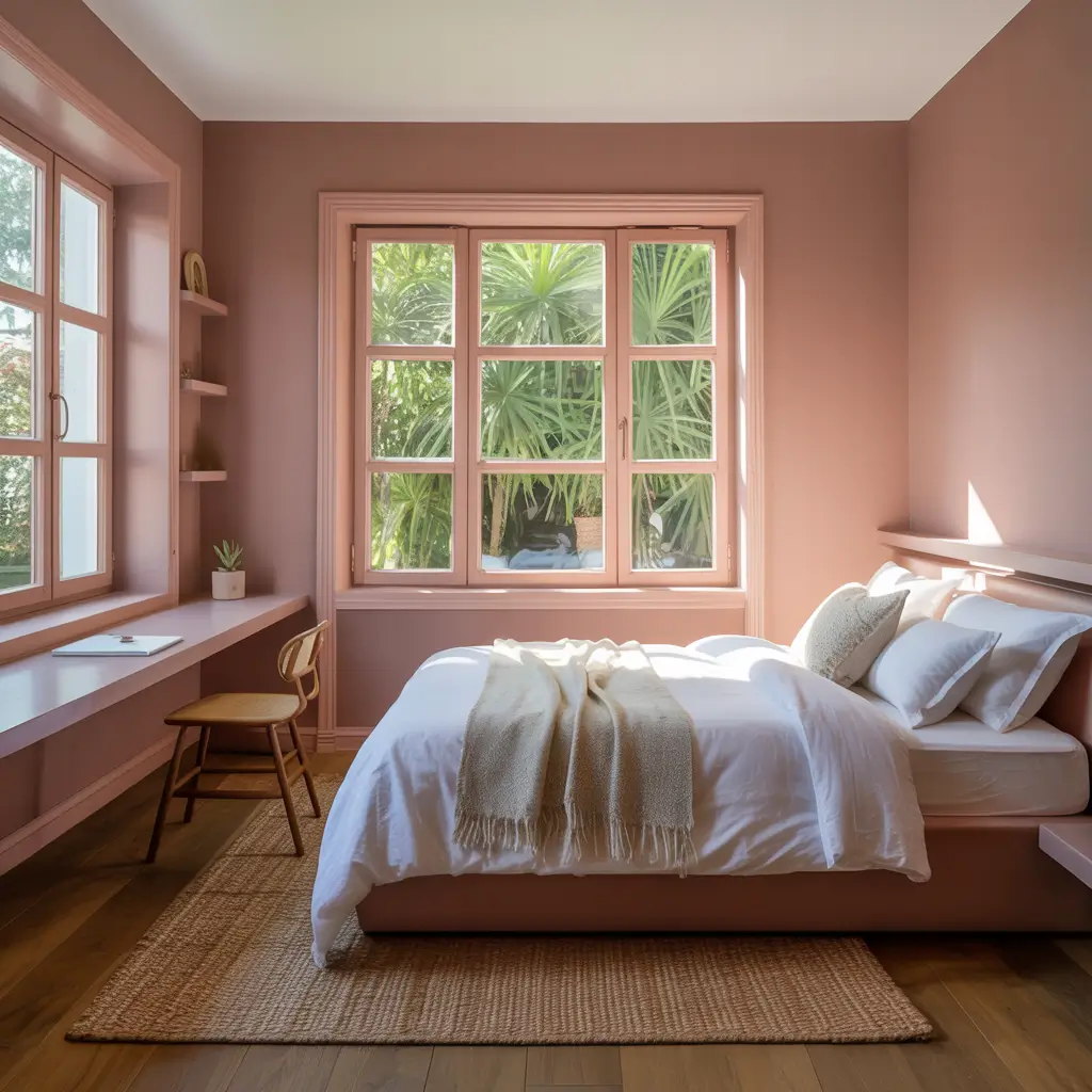 The strategy for small spaces? Use dusty pink on all walls to create continuity. This eliminates visual breaks that chop up the space. Then keep everything else light and minimal—white bedding with pink accents, light wood furniture, and mirrors to bounce light around.