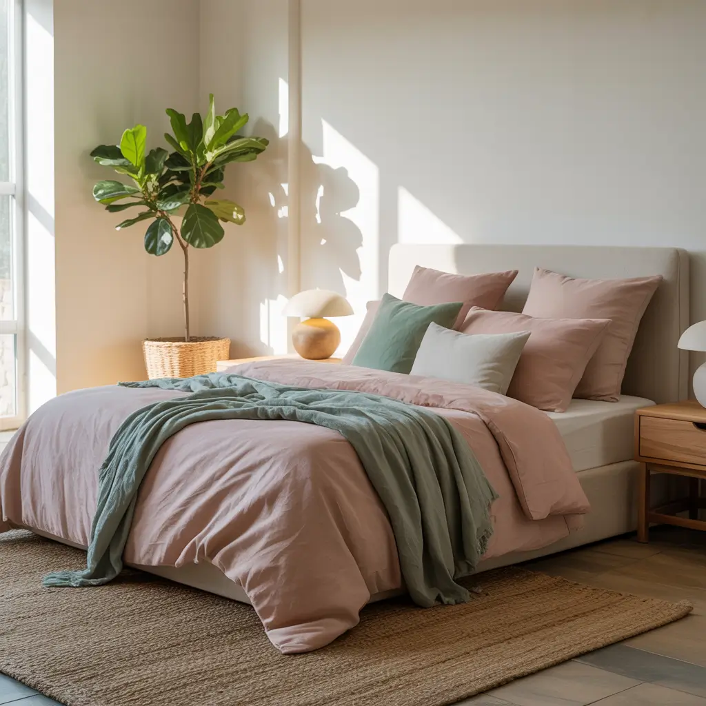 - Linen bedding in dusty pink adds visual interest without pattern chaos