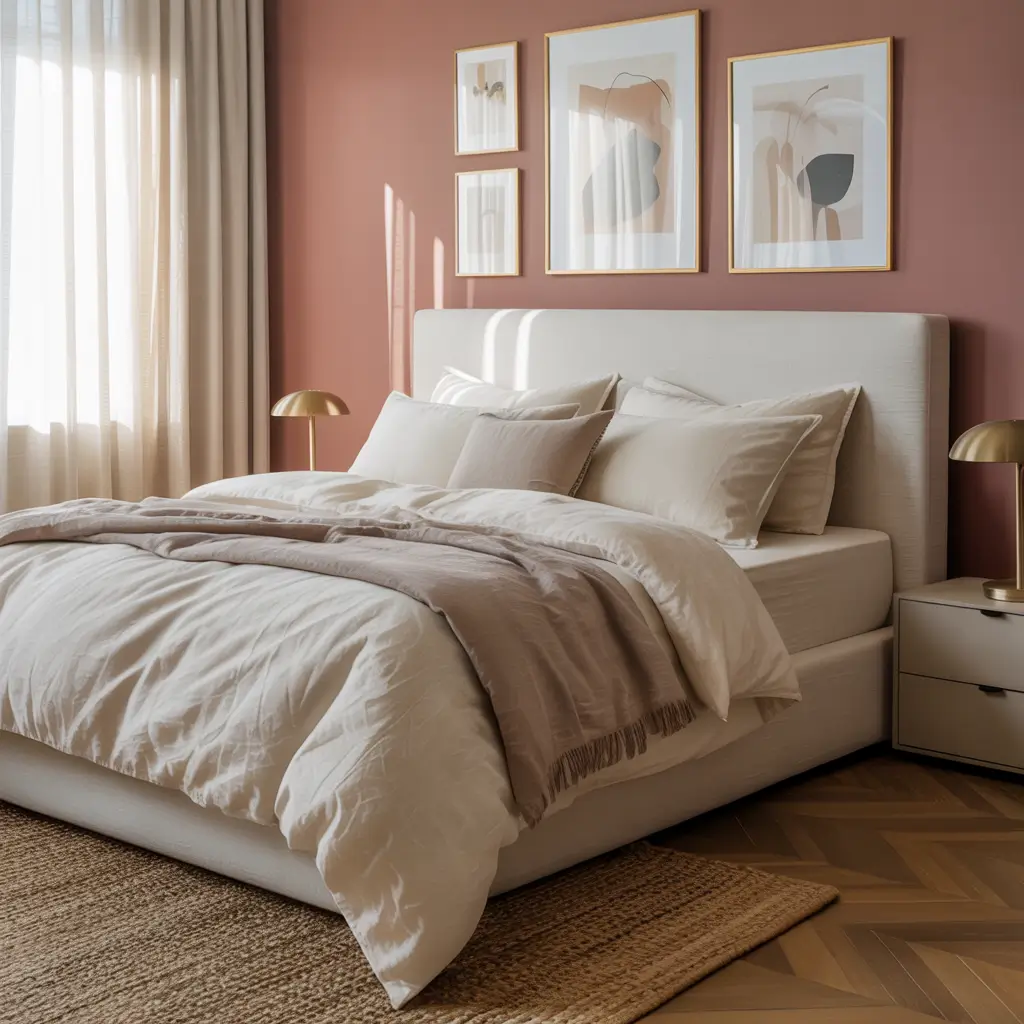 The best part about dusty pink? It’s forgiving. It plays well with other colors, works in any lighting, and somehow makes everyone look good in morning selfies. What more could you want from a bedroom color?