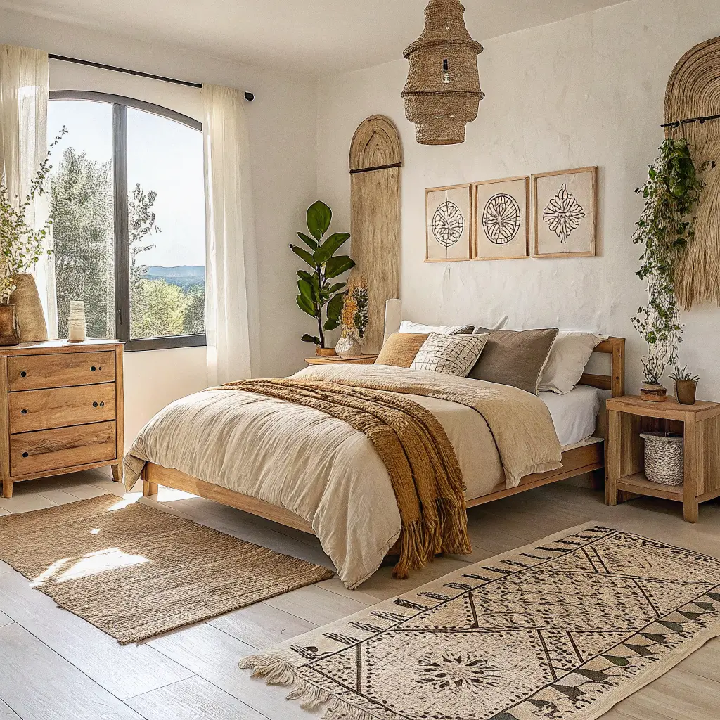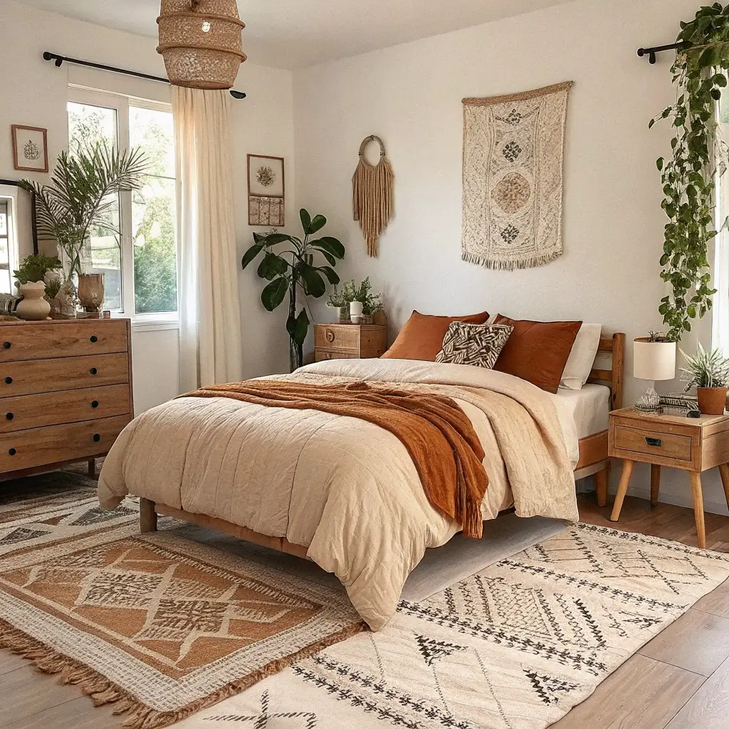 I love this aesthetic because it doesn’t require choosing between style and comfort. You get both! Think platform beds in warm wood tones, geometric planters with trailing pothos, and abstract art in earth tones.