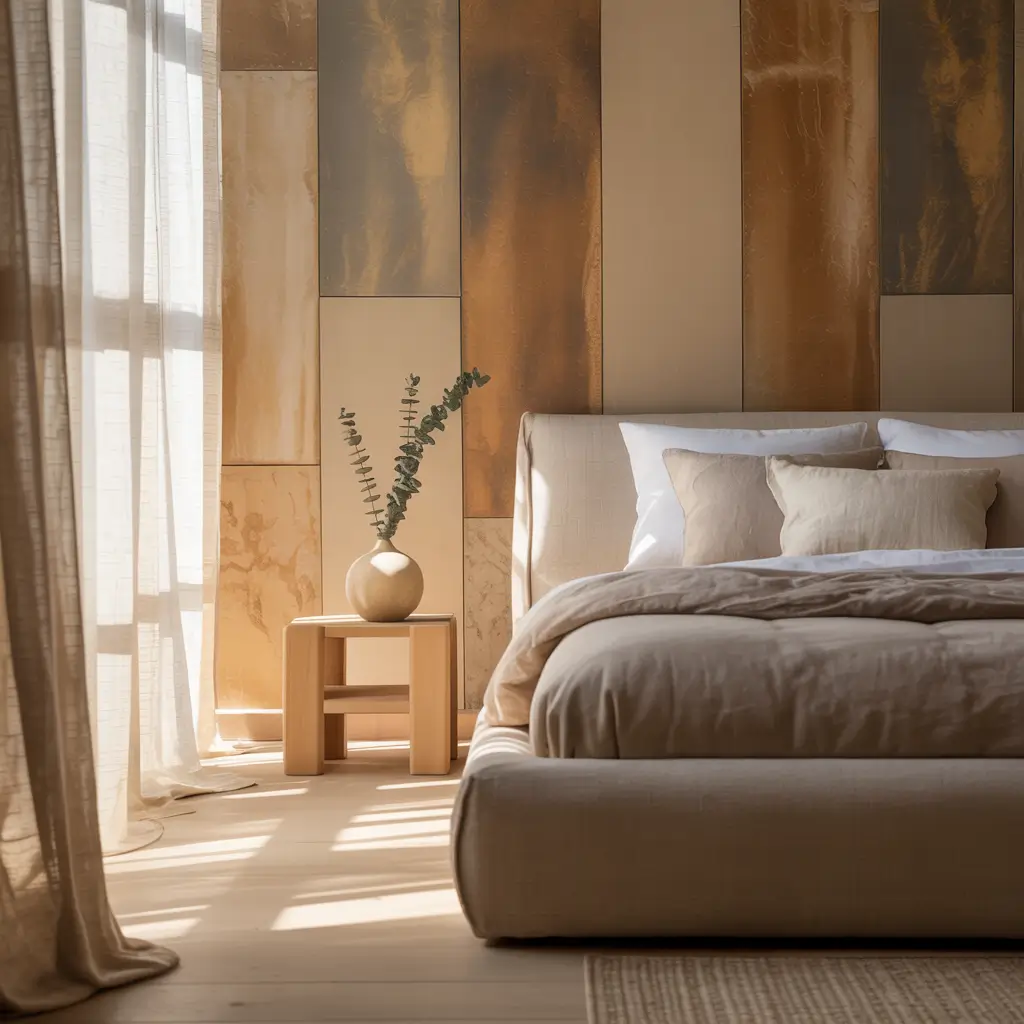 9. Earthy Modern Bedroom with Textured Wall Panels