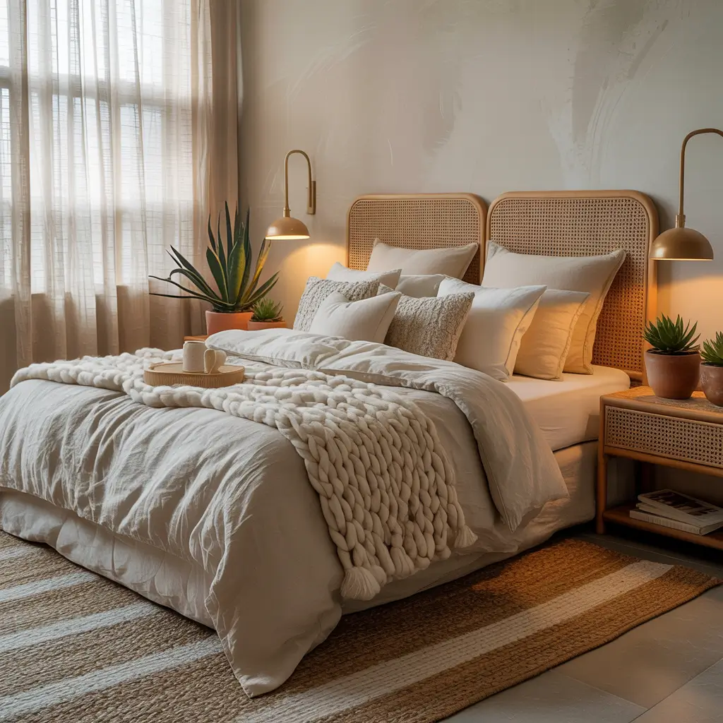 Woven textures bring that instant coastal-meets-bohemian vibe that makes a bedroom feel like a high-end retreat. Rattan and wicker aren’t just for beach houses anymore.