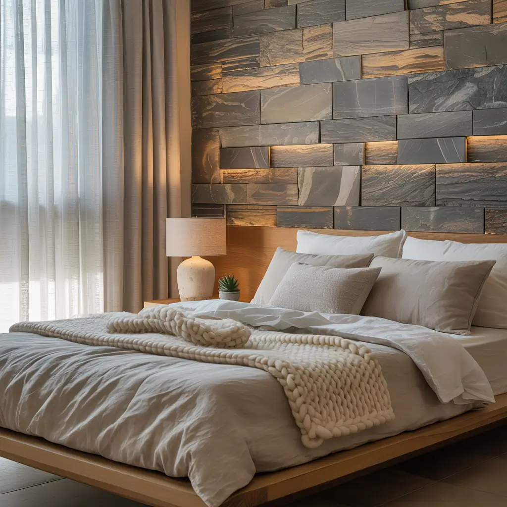 Stone brings that grounding energy that makes a bedroom feel like a sanctuary. Natural stone elements add luxury and permanence to your space.