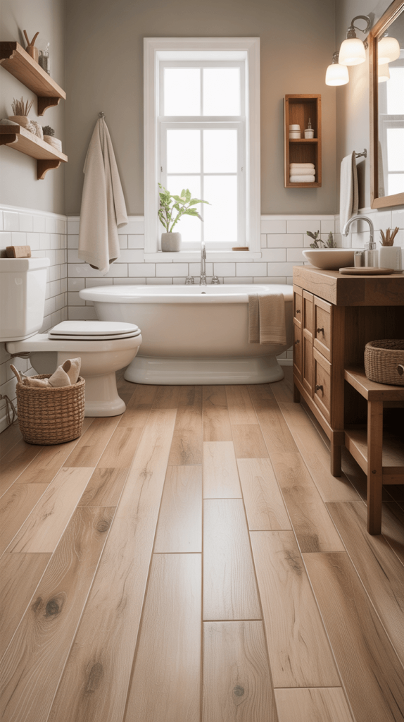 Wait, wood in a bathroom? Isn’t that a moisture nightmare? With real wood, absolutely. But with wood-look luxury vinyl or laminate peel and stick planks? You get all the warmth, texture, and cozy cabin feeling with 100% waterproof peace of mind.