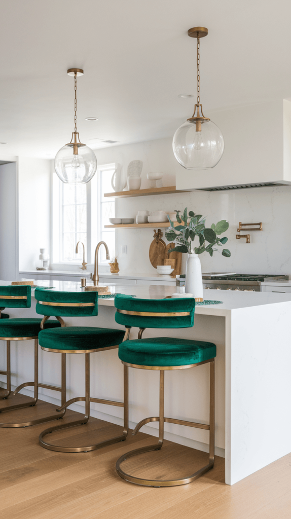 This is the easiest, most rental-friendly, zero-commitment way to dip your toes into the emerald green water. Adding emerald green bar stools or a banquette seat is an instant injection of color and personality.
