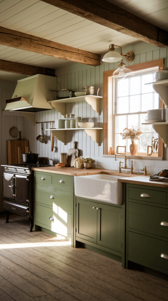 Swap out the gold hardware for matte black or oil-rubbed bronze. Pair the green cabinets with a farmhouse sink, shaker-style cabinet doors, and open wooden shelves. Maybe even choose a countertop with some movement, like a quartz that looks like marble, to keep it from feeling too rustic. The green adds a unexpected and sophisticated twist to a classic style.