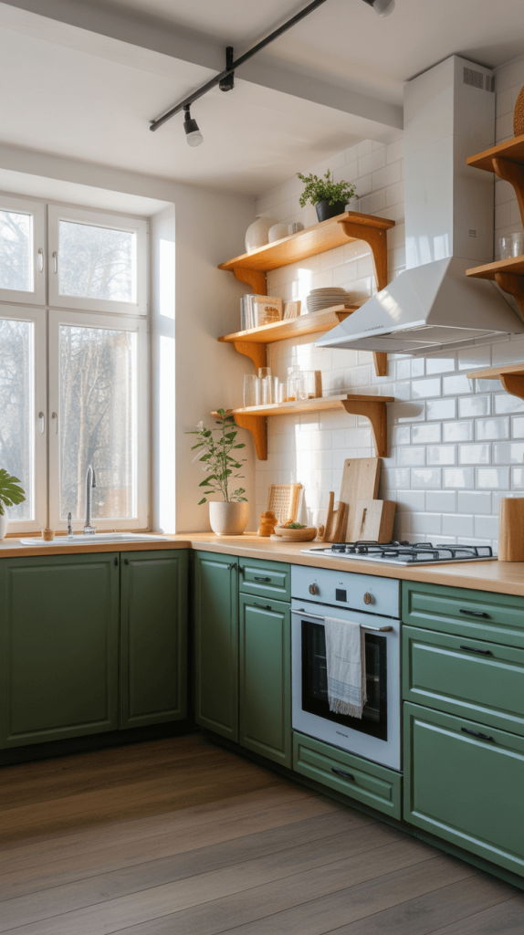 • Other Two-Tone Ideas: Green uppers and white lowers (a bit more unexpected), green on the island with white on the perimeter cabinets, or even green cabinets with white open shelving. The possibilities are endless!