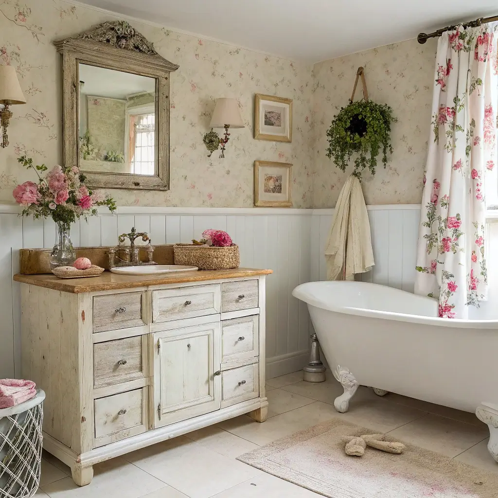 Shabby chic gets a bad rap sometimes (I blame the overdone versions from the early 2000s), but when done right, it creates the most romantic cottage bathrooms. Think distressed furniture, soft pastels, and vintage lace – but with restraint.