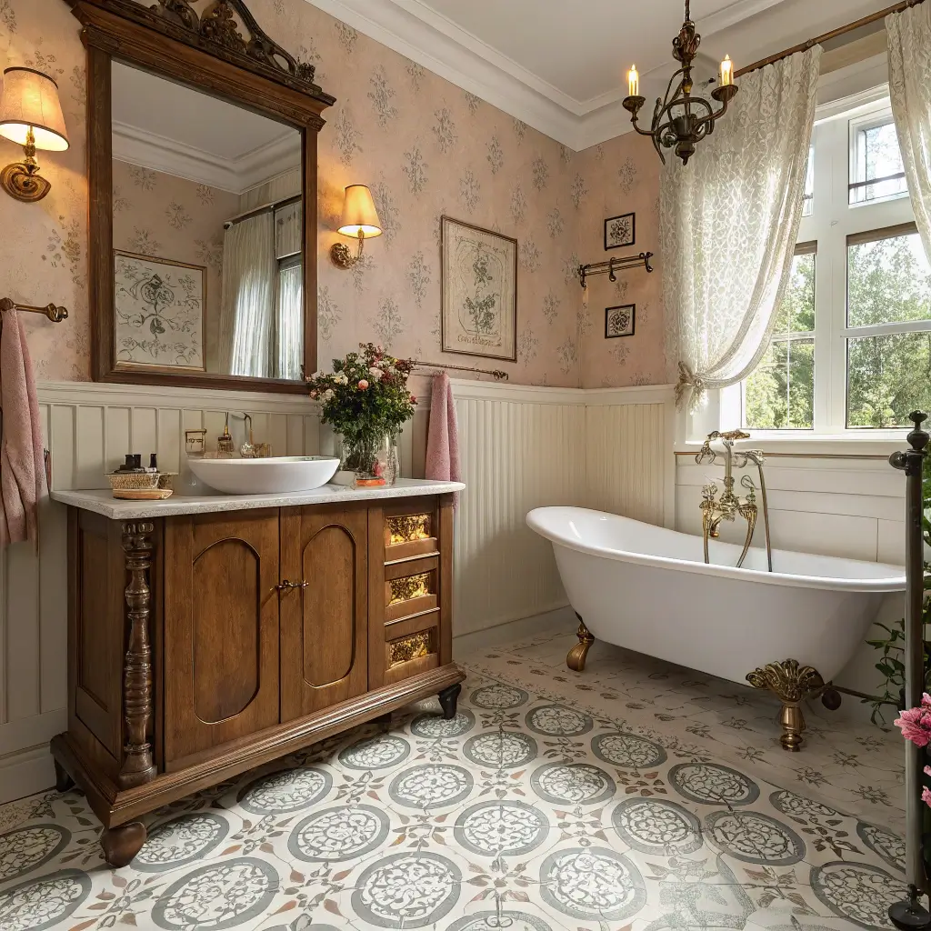 Okay, I know what you’re thinking – wallpaper in a bathroom? Hear me out. Floral wallpaper creates that quintessential English cottage atmosphere like nothing else can. Yes, it requires proper ventilation and maybe some protective coating, but the payoff is absolutely worth it.