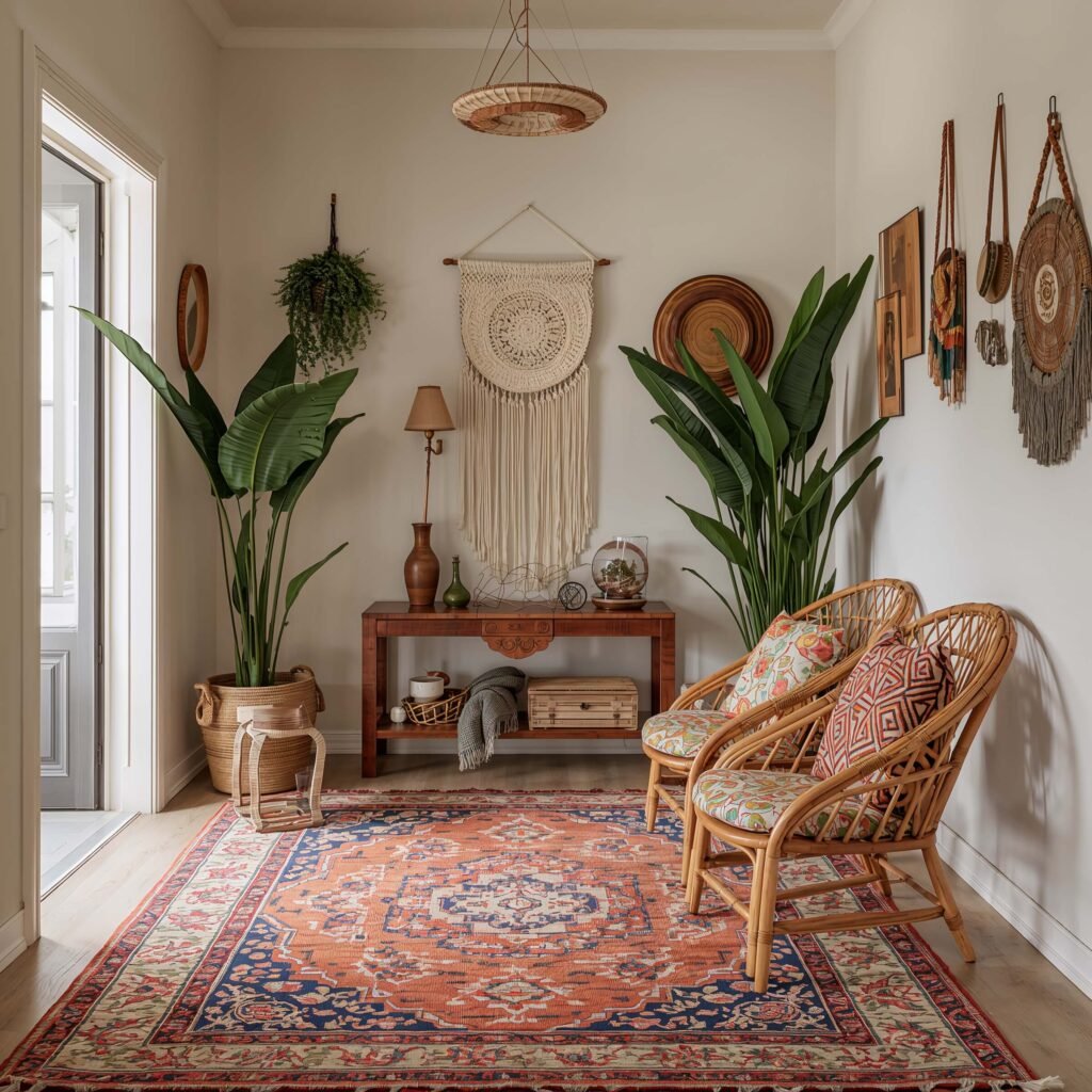 Can we talk about how boho style basically gives you permission to break all the rules? Your entrance becomes this eclectic, collected-over-time vibe that feels both intentional and effortless. Plus, you get to shop for plants and call it “decorating” 🙂