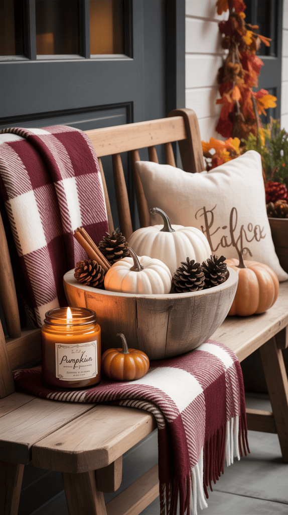- Fall: A plaid blanket, a bowl of pinecones, and a pumpkin-scented candle.