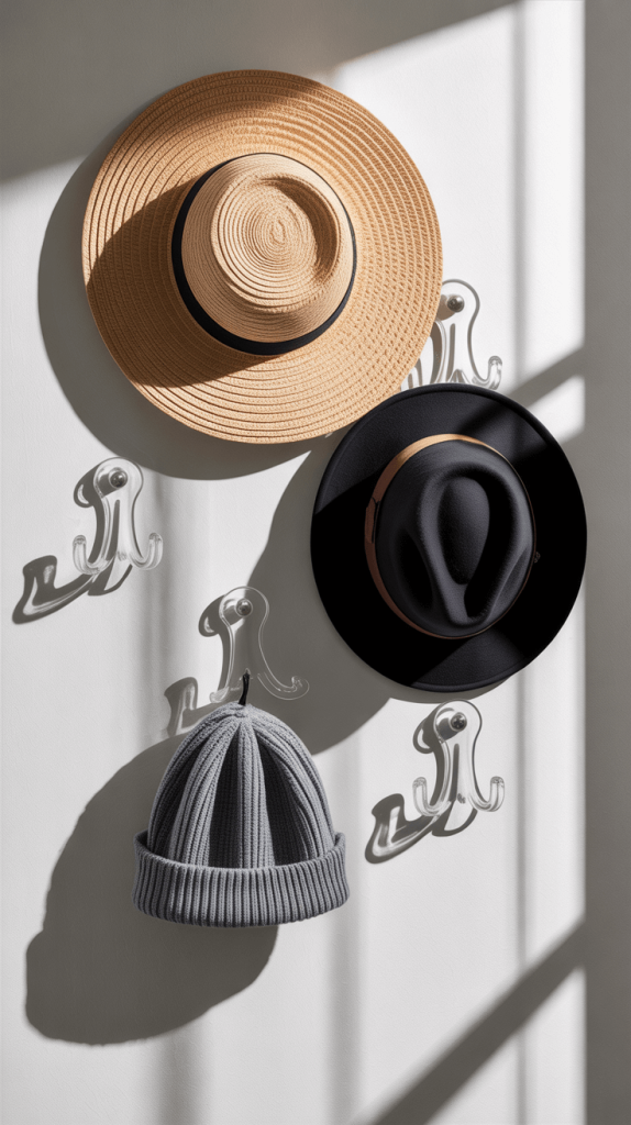 You can use simple wooden pegs or clear acrylic hooks to make the hats themselves the star. It’s an unexpected touch that says you don’t take design—or yourself—too seriously.