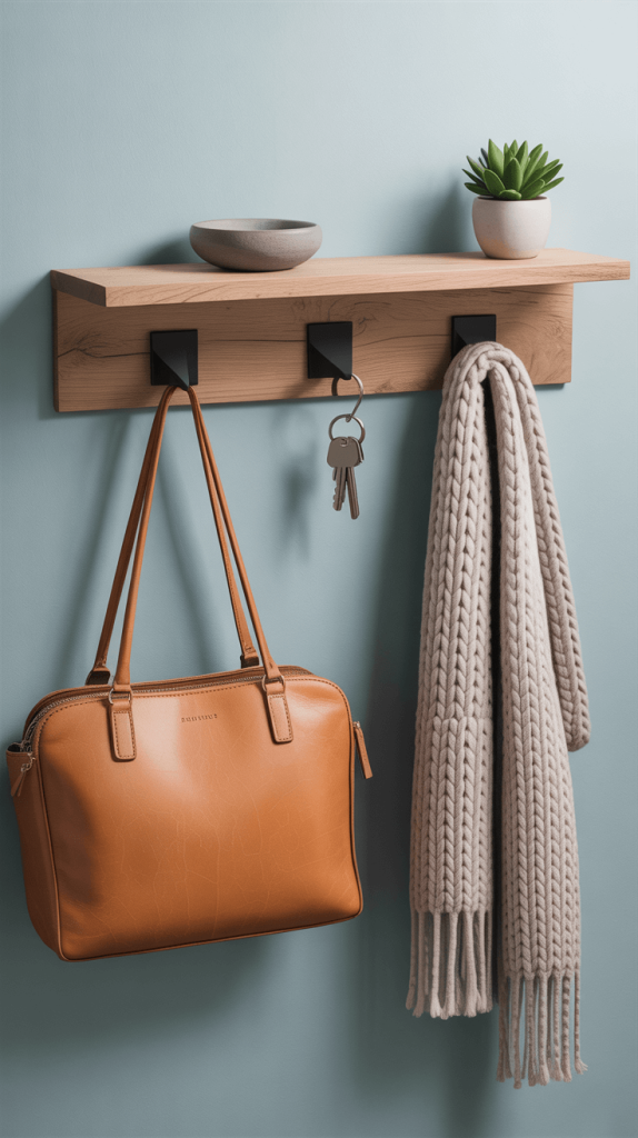 • Stylish Hooks: Ditch the boring white plastic hook strip. Opt for individual brass hooks, modern geometric shapes, or even vintage knobs mounted to a piece of stained wood. They become a sculptural element.