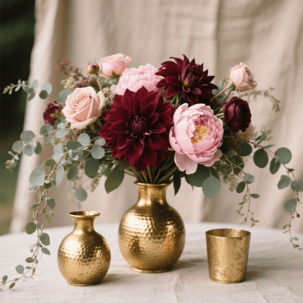 Burgundy dahlias, deep red roses, and blush pink garden roses create stunning contrast when paired with seasonal greenery like eucalyptus or dusty miller. Add some texture with burgundy scabiosa or chocolate cosmos for depth. The key is balancing the deep, moody tones with lighter elements so your arrangements don’t feel heavy.