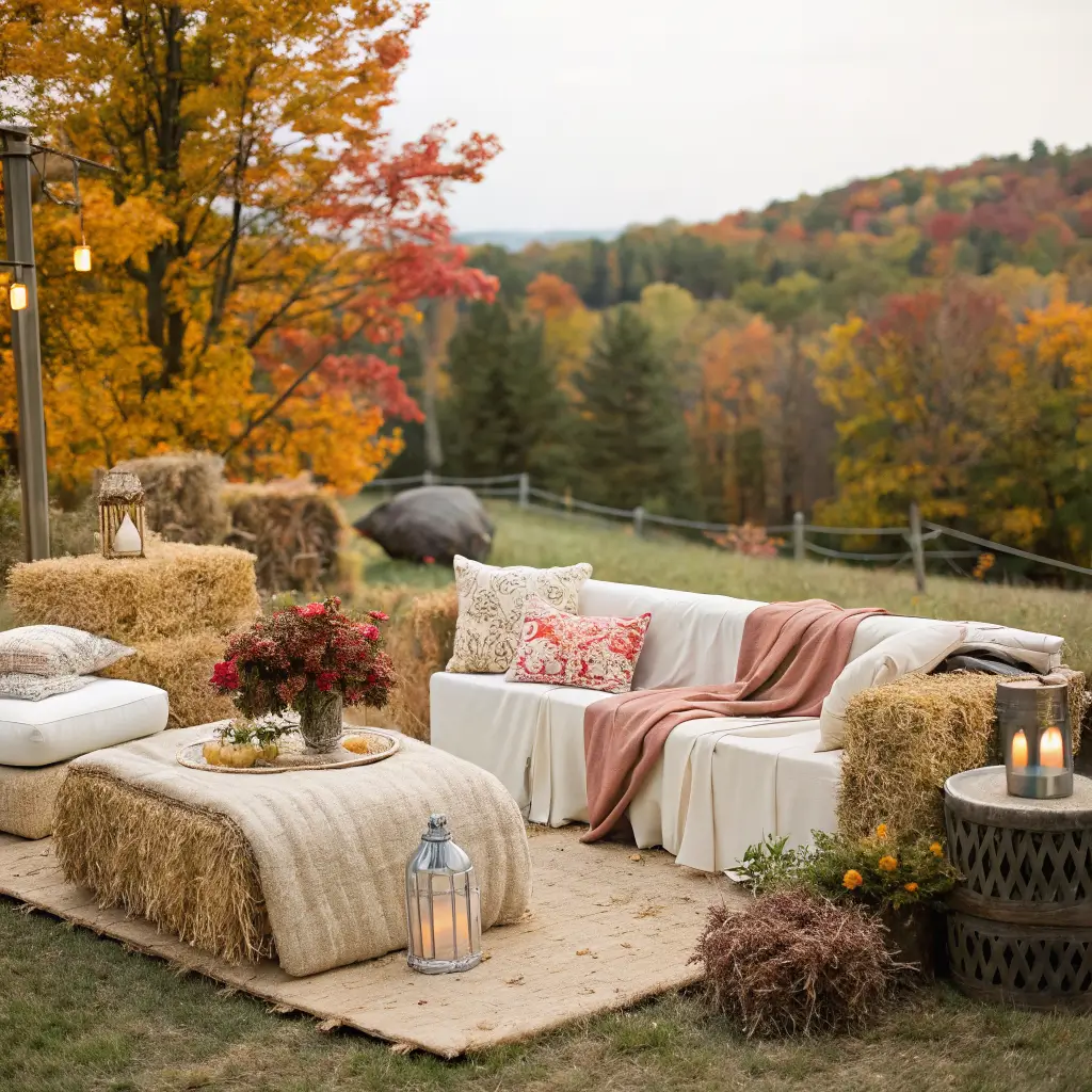 Cover your hay bales with beautiful blankets or throws in rich autumn colors. Add some throw pillows in complementary patterns – think plaid, velvet, or even faux fur for texture. Arrange them in conversation clusters around low tables made from tree stumps or rustic wooden crates.