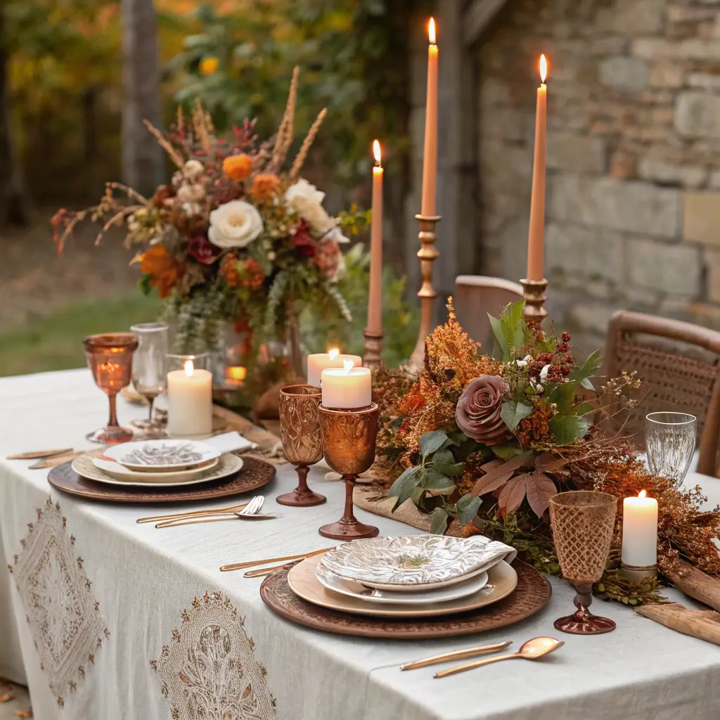 Metallic accents in warm tones are absolute game-changers for fall table settings. Copper and bronze add sophistication while complementing the natural autumn color palette perfectly. I’m talking charger plates, flatware, candlesticks, and even napkin rings in these gorgeous warm metals.