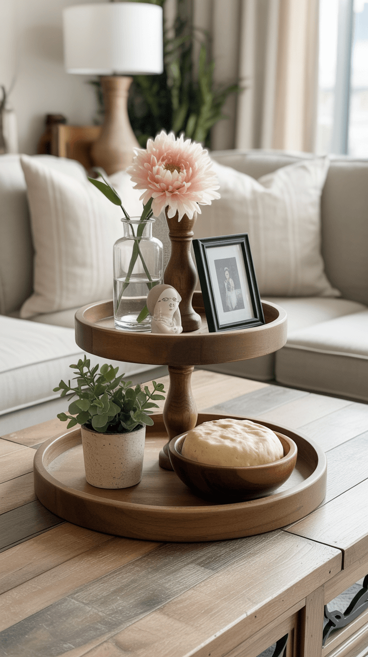If you’re working with a larger table or you’re a maximalist at heart, a tiered tray is your secret weapon. It allows you to create a rich, detailed vignette without taking up a ton of surface area because you’re building up.