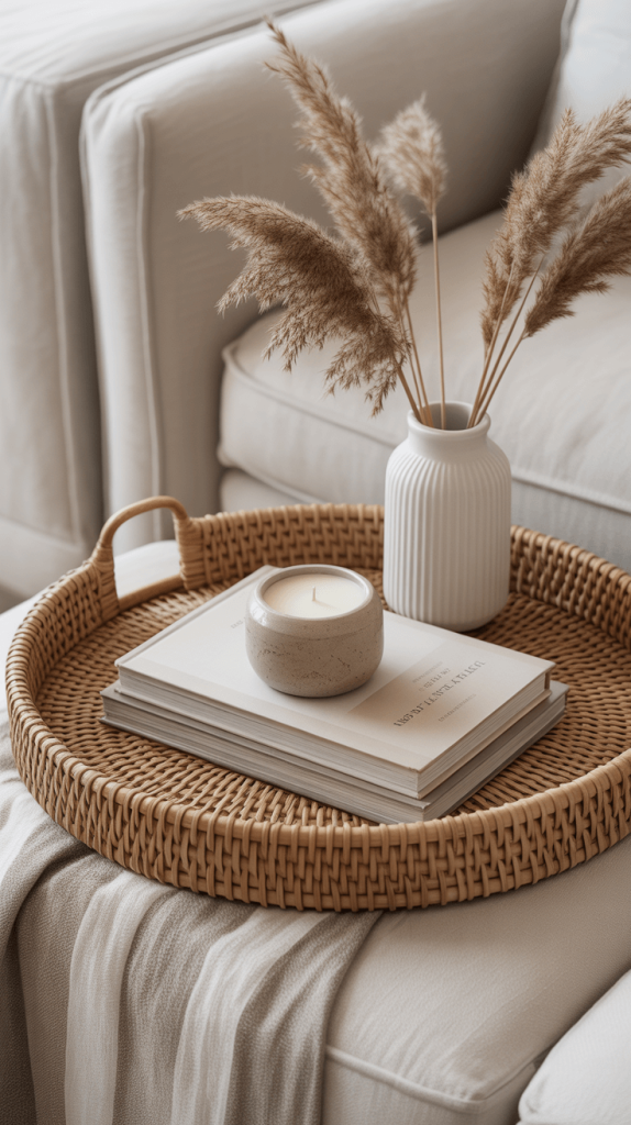 • Start with a Textural Base: A woven rattan tray, a chunky knit throw blanket draped over the corner of the table, or a linen runner.