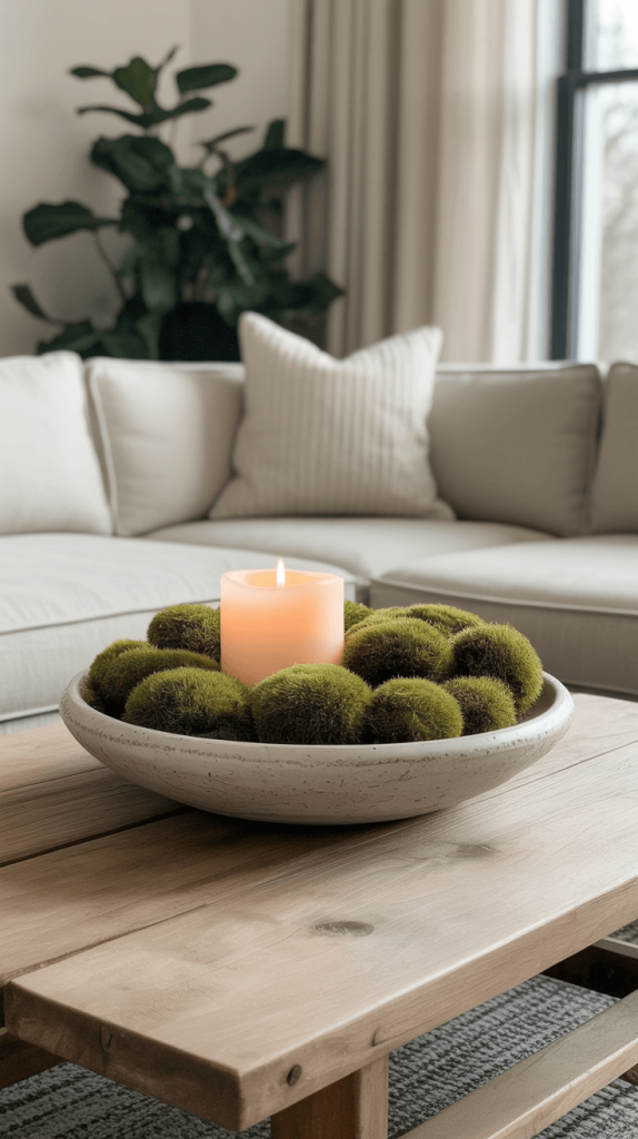 • A Simple Duo: A low, wide bowl filled with a single type of element (all lemons, all moss-covered balls, all smooth stones) paired with one fat candle.