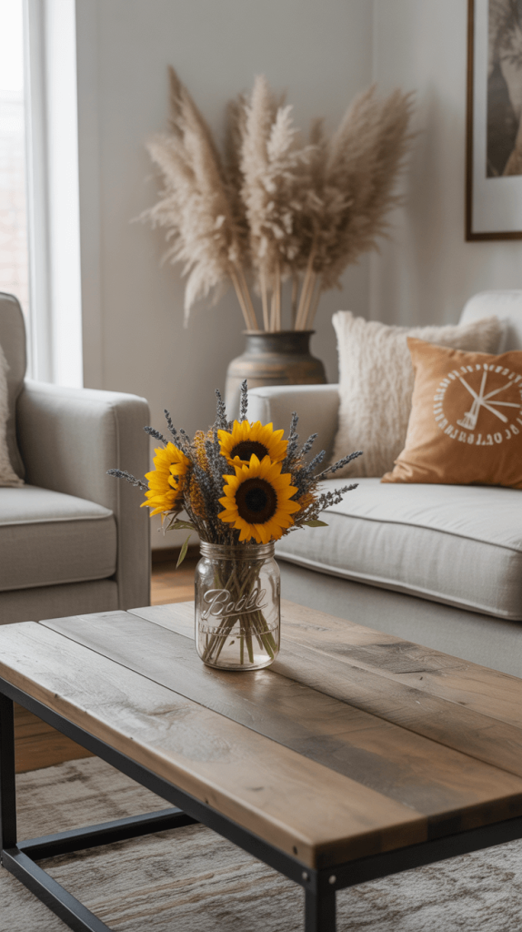 2. Farmhouse Coffee Table with Seasonal Centerpieces