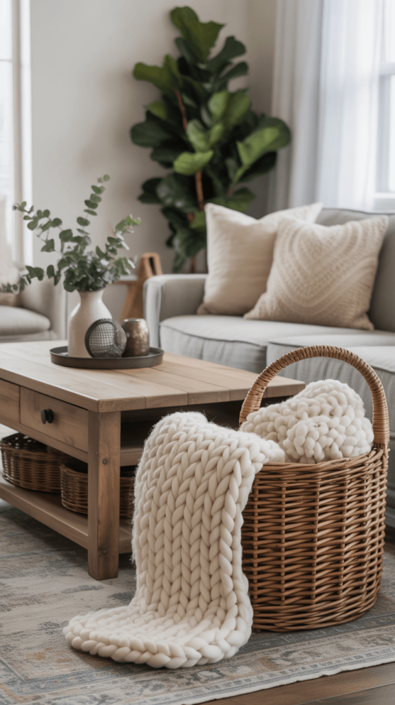 2. The Blanket: Choose a throw in a chunky knit, soft sherpa, or neutral linen. You can fold it neatly and place it in the basket, or for a more “lived-in” look, drape it over the corner of the coffee table itself, letting it pool a little on the floor.