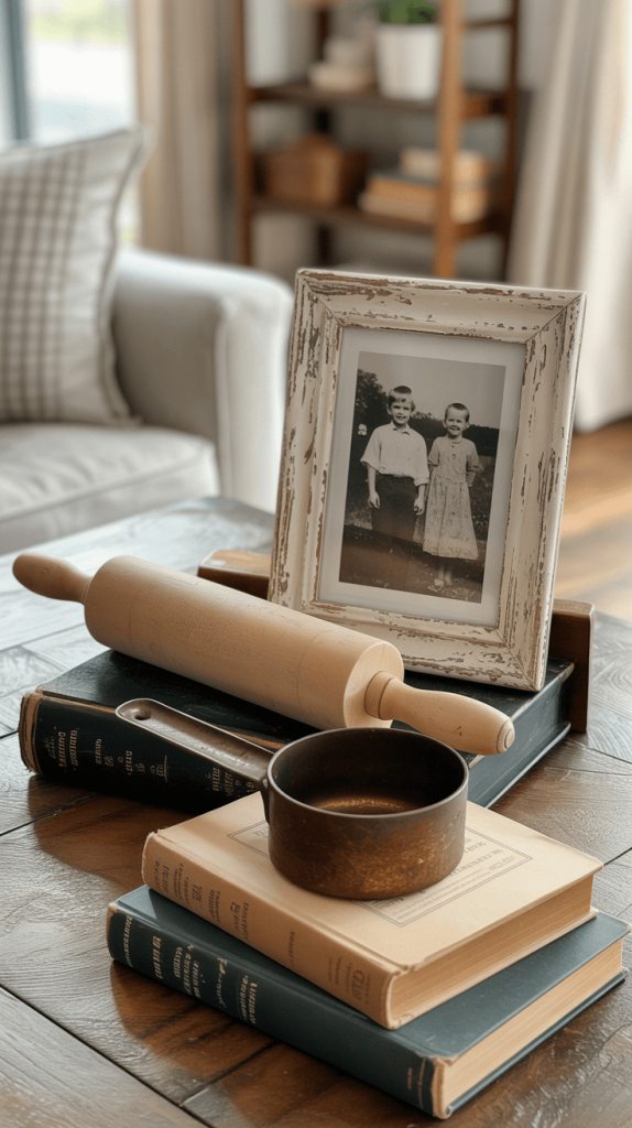• Middle Tier (The Connector): Medium-sized items. A tiny framed photo, a small clock, a ceramic figurine, a stack of vintage coasters.