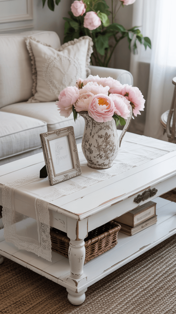 • Distressed Furniture: A coffee table with a white or pastel painted finish that’s been lightly sanded to show wear on the edges.