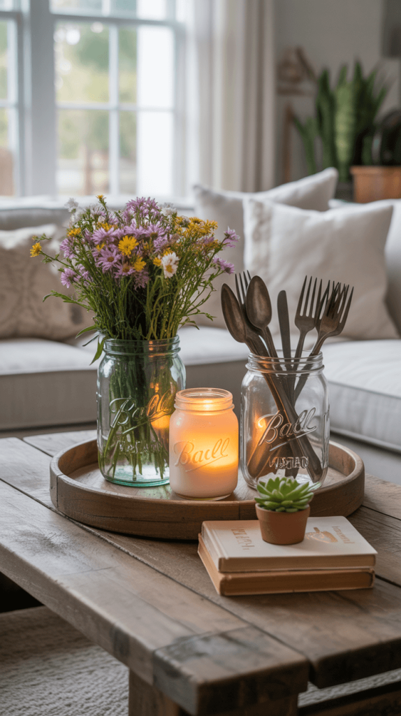 A wooden tray, preferably one with a weathered finish or a hint of chippy paint, is your new best friend. It instantly creates a defined zone on your table, corralling smaller items so they look intentional, not messy. Now, what to put on said tray? Enter the humble mason jar.