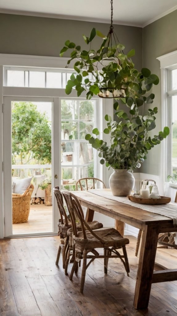 Nothing softens a farmhouse dining room like plants and fresh greenery. A vase of eucalyptus, a pot of herbs on the table, or a leafy fig tree in the corner can instantly bring life to the room. Natural elements keep the space fresh and welcoming year-round.