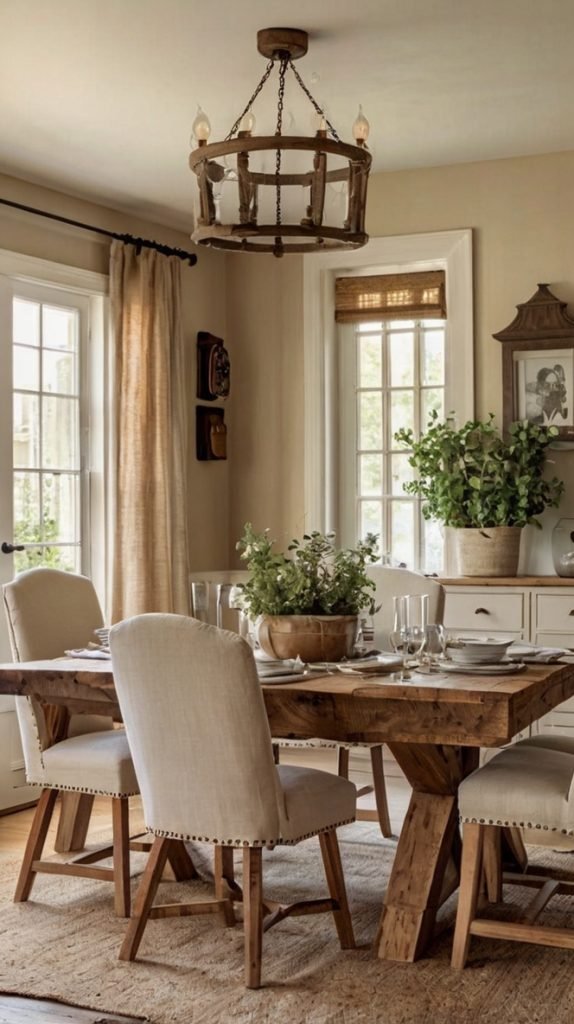 One of the easiest ways to create a farmhouse dining room is to combine rustic wood furniture with soft, neutral colors. Think weathered oak tables, linen chairs, and creamy white walls that make the space feel bright and welcoming. This contrast instantly sets the cozy farmhouse tone.