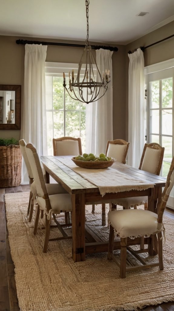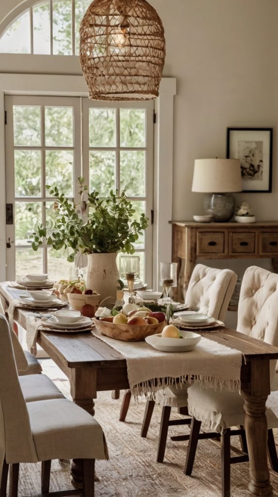 Textiles are a secret weapon in farmhouse décor. Layer your dining space with cotton table runners, linen napkins, and woven placemats to add texture and warmth. Choose natural tones like beige, cream, or muted gray for a relaxed, welcoming look.
