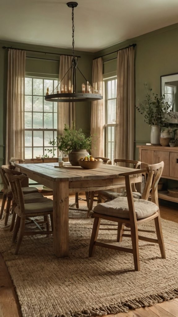 If your dining room feels too plain, add pops of muted blue or mustard through cushions, wall art, or dishware. The key is to keep the palette harmonious and natural.