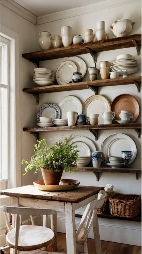 Open shelves give you a chance to display beautiful dishes, jars, or small décor pieces. In a farmhouse dining room, wooden shelves with metal brackets look both functional and stylish. They’re perfect for showing off your favorite mugs, plates, or seasonal decorations.