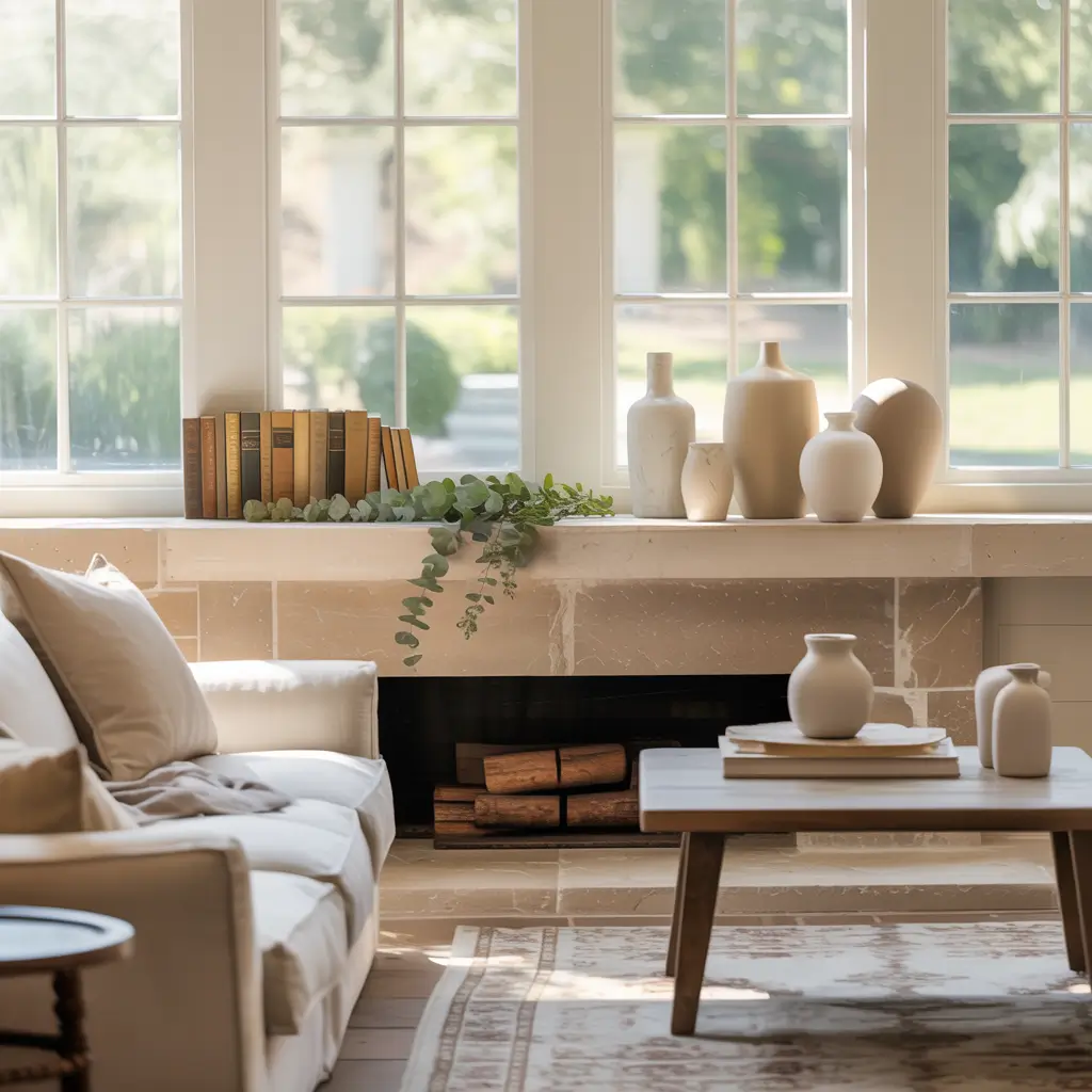1. Neutral Farmhouse Fireplace Mantel Styling