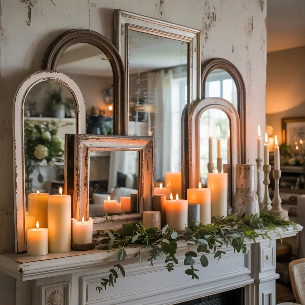 The key is mixing different shapes, sizes, and frame styles. Maybe a large round mirror in the back with a smaller rectangular one leaning in front. Or a vintage window frame mirror paired with a simple round one. The layering creates depth and makes your mantel look thoughtfully curated instead of thrown together.