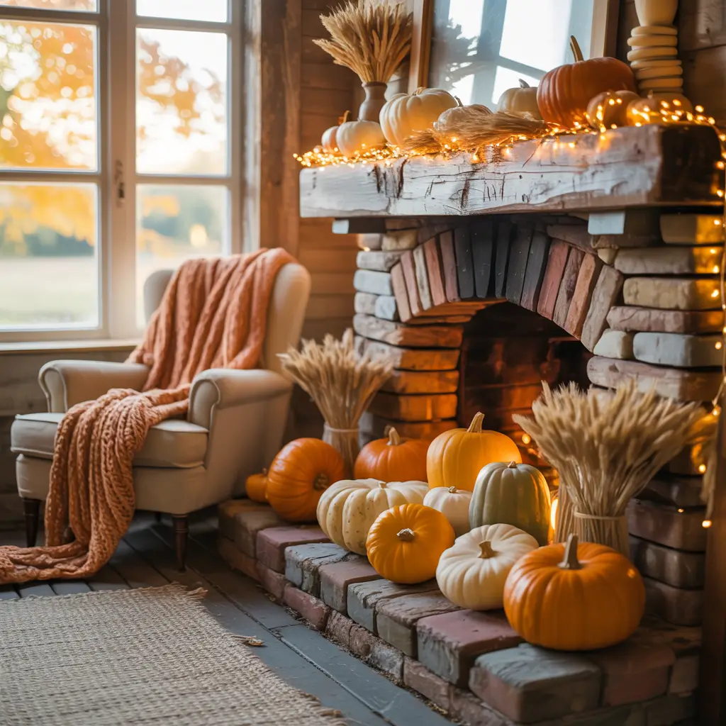 6. Seasonal Farmhouse Fireplace Fall Decor
