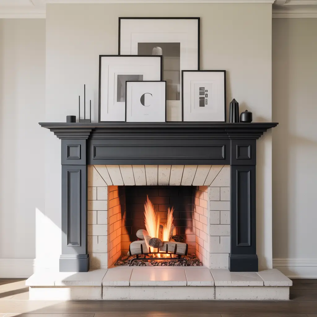 - Black fireplace surround with white and cream accessories