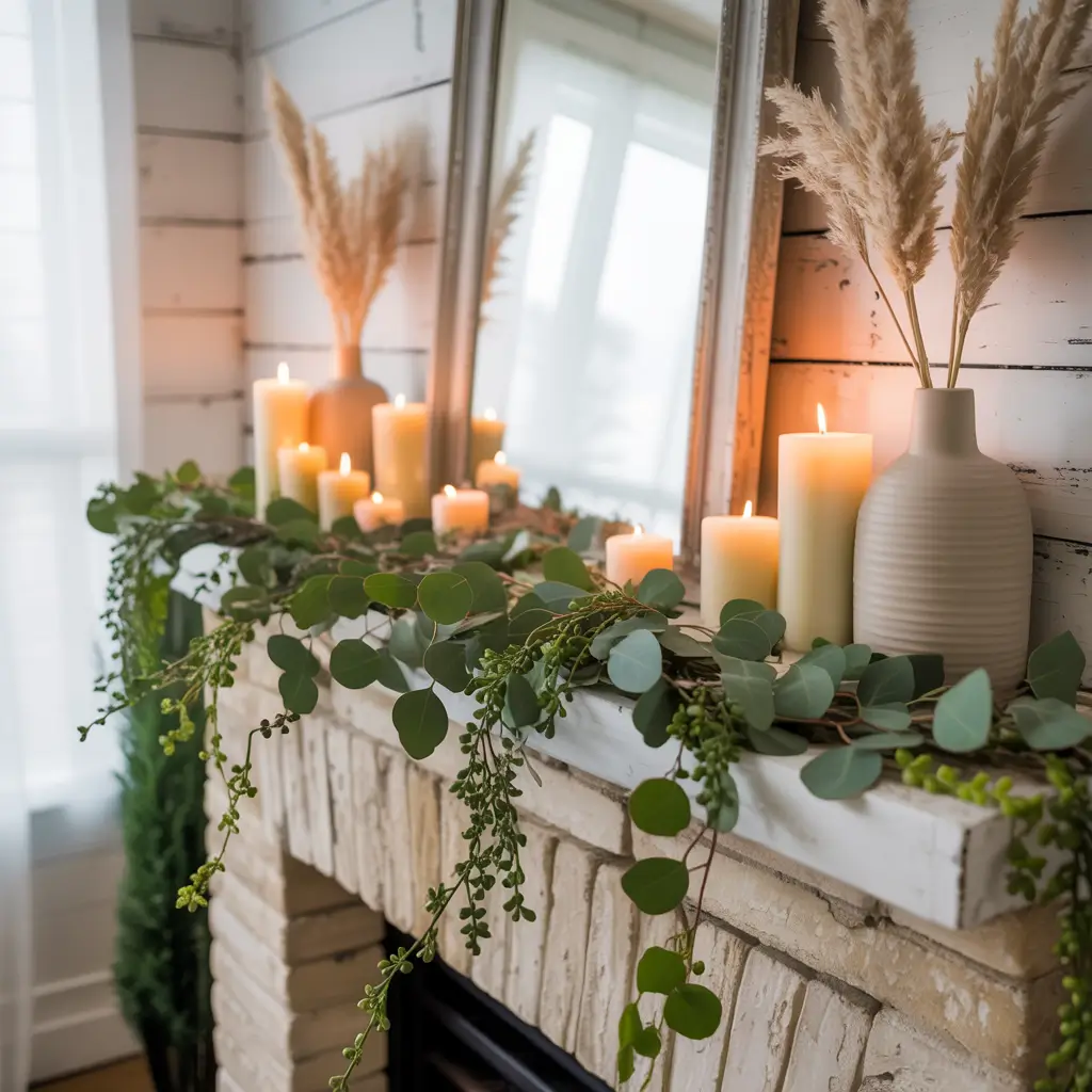 - Eucalyptus garland draped naturally along the mantel