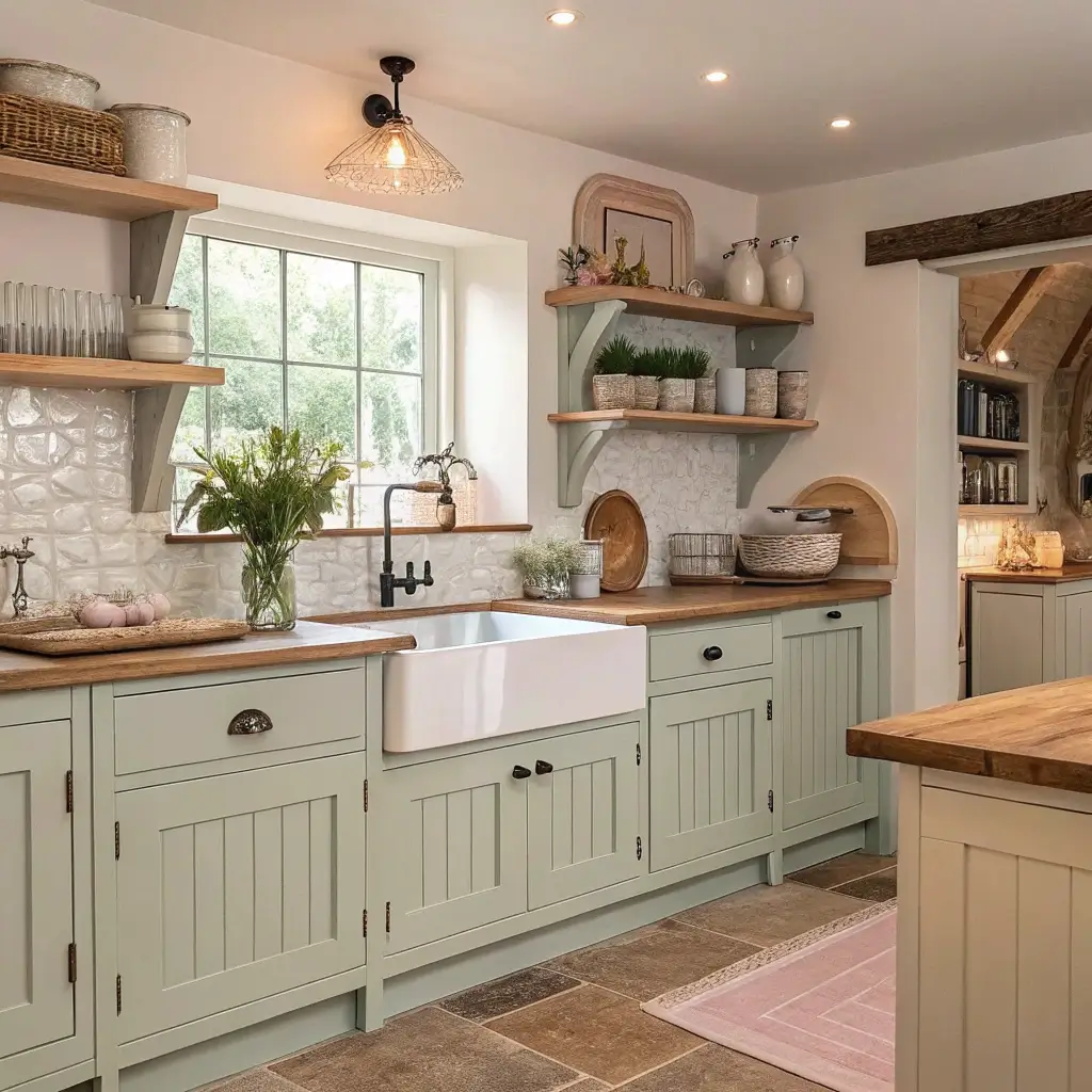 • Cream cabinets with sage green island (hello, cottage vibes!)
